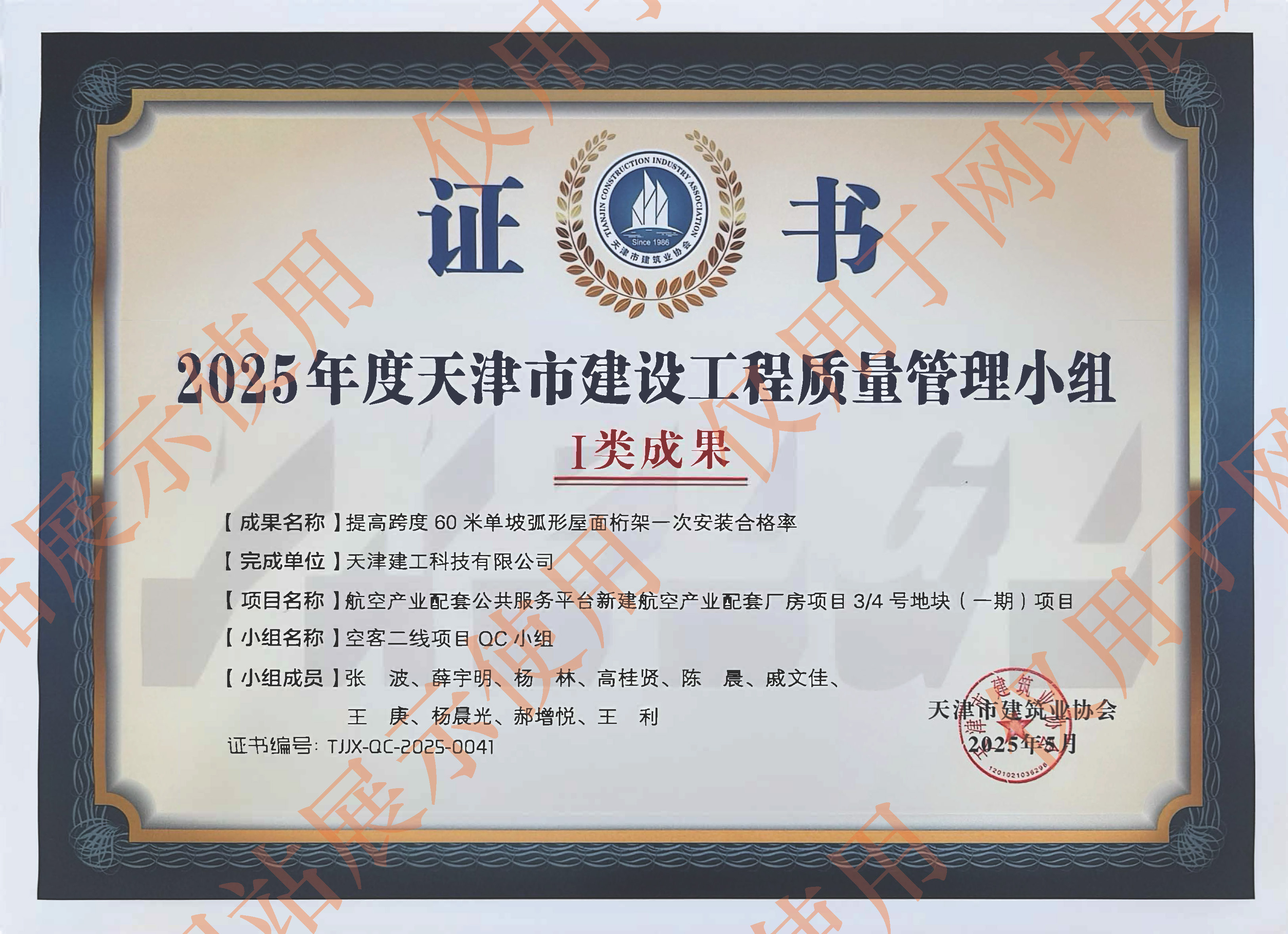 2025年度天津市建設工程質量管理小組Ⅰ類成果_提高跨度60米單坡弧形屋面桁架一次安裝合格率