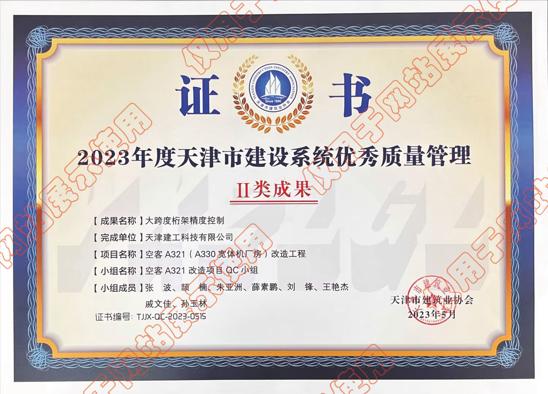 2023年度天津市建設系統優秀質量管理Ⅱ類成果_大跨度桁架精度控制