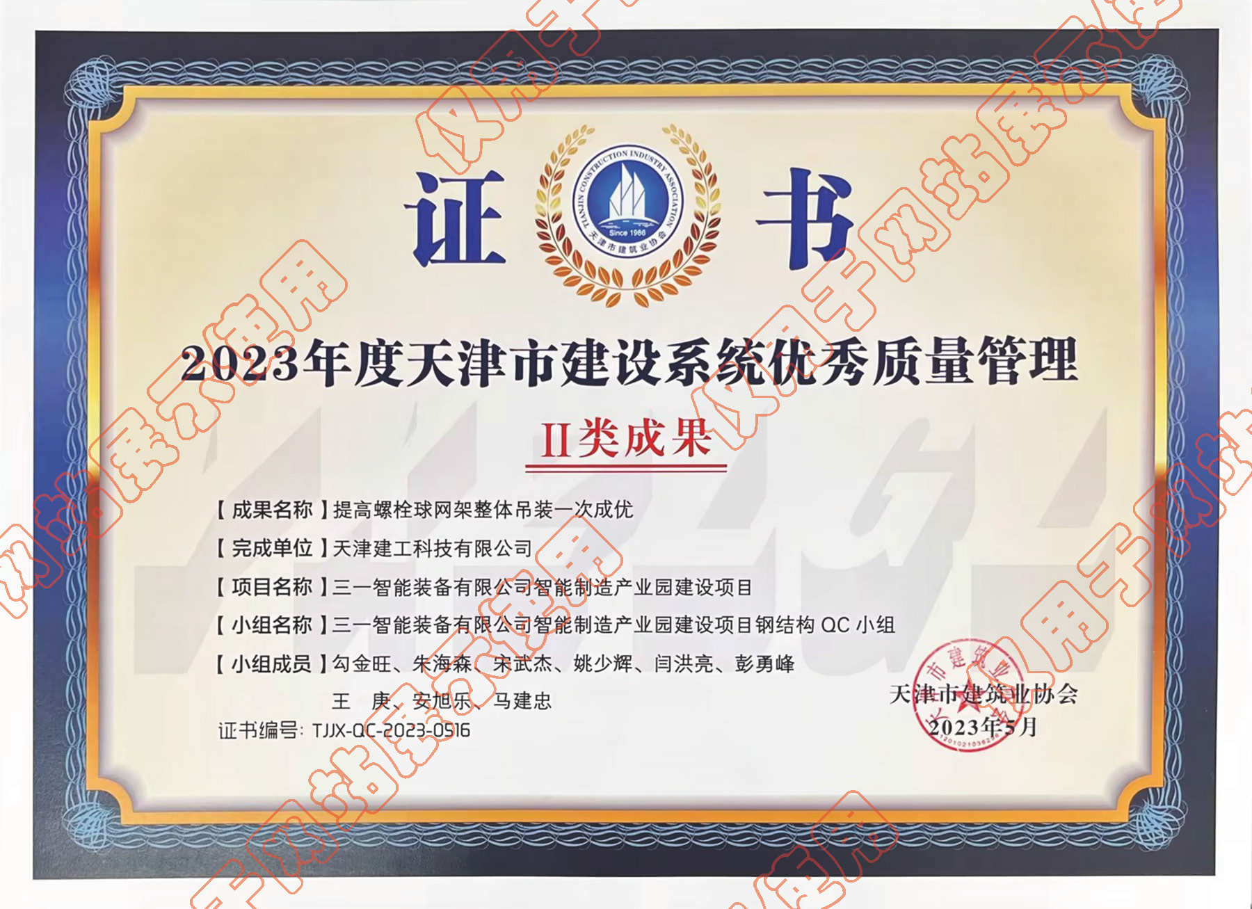2023年度天津市建設系統優秀質量管理Ⅱ類成果_提高螺栓球網架整體吊裝一次成優