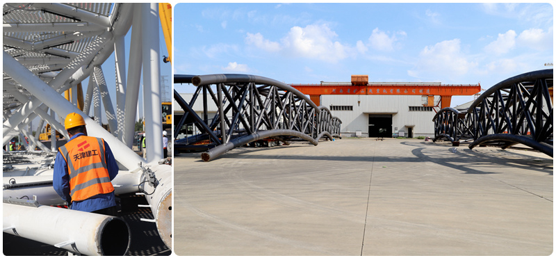 工程位于天津九園公路與京津公路交口,結(jié)構(gòu)類(lèi)型為鋼結(jié)構(gòu)桁架,最大高度25.5米,單跨最大跨度70米,鋼結(jié)構(gòu)單件最大起重量50噸。