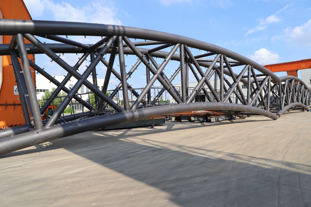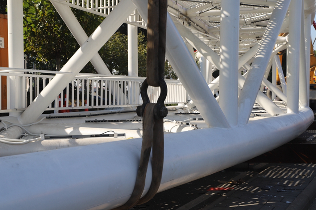 該標志門單體重150噸,跨度78米,高40米,每個標志門由五個構件組成,運抵現場地面拼裝為長短兩節進行吊裝,最后在高空合攏焊接完成。